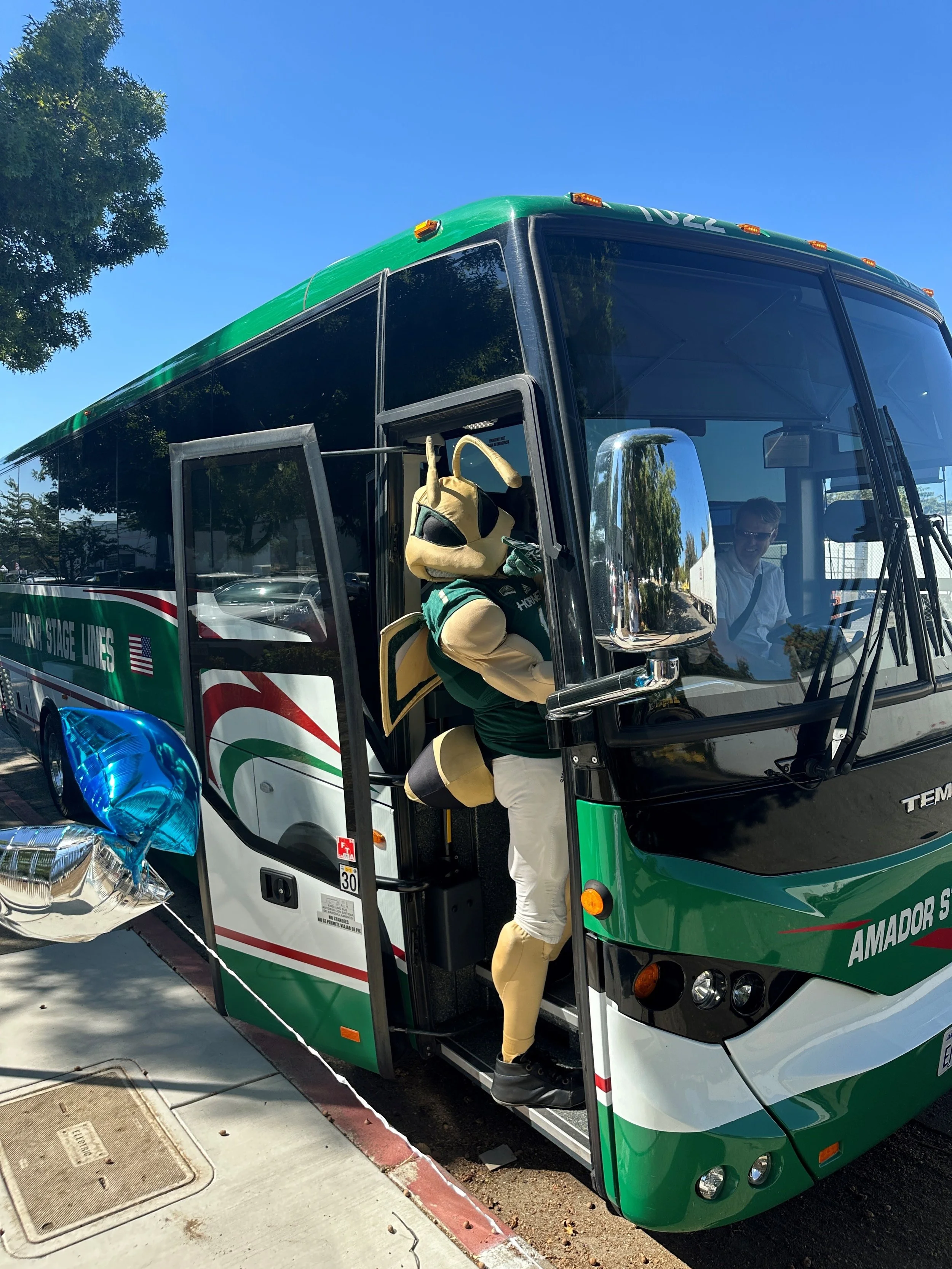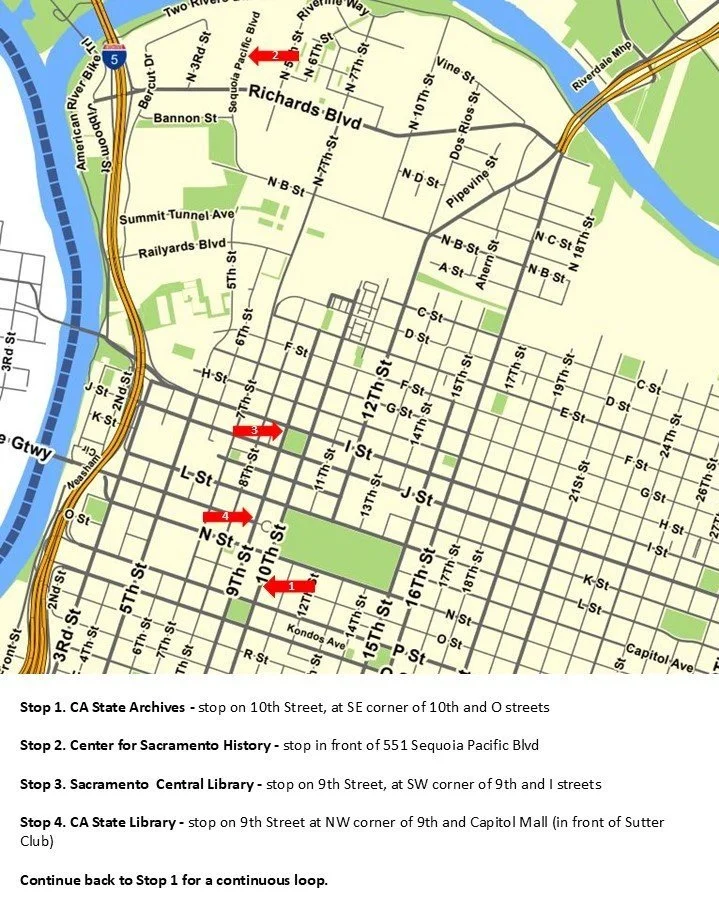 Free bus transportation is provided between all four locations: the California State Library, the California State Archives, the Central branch of the Sacramento Public Library, and the Center for Sacramento History. Bus stops include the schedule and balloons to mark the stop.